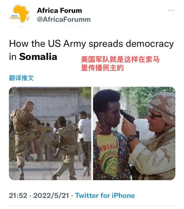 網(wǎng)友“Africa Forum”發(fā)帖反諷道,“美國(guó)軍隊(duì)就是這樣在索馬里推廣民主的”。畫(huà)面中,一位美國(guó)大兵正用槍抵著當(dāng)?shù)厝说哪X袋,另一位美國(guó)大兵正一腳踹向當(dāng)?shù)匦∧泻?,并以此為?lè)。