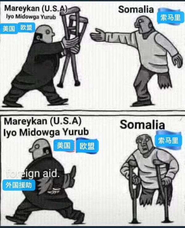更有非洲網(wǎng)友為美國(guó)重新派兵索馬里一事,創(chuàng)作了諷刺漫畫(huà),畫(huà)中代表美西方國(guó)家的禿頂富商,向斷了一條腿的“索馬里”送來(lái)了拐杖,而代價(jià)卻是打斷了“索馬里”的另一條腿,這樣他就只能永遠(yuǎn)依靠美西方的援助了。
