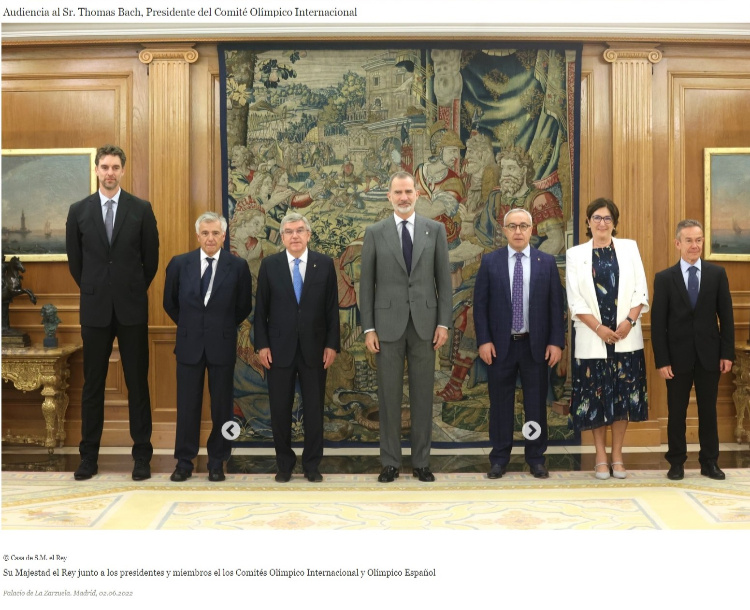 西班牙國(guó)王費(fèi)利佩六世同國(guó)際奧委會(huì)主席巴赫一行合影。西班牙王室網(wǎng)站截圖 |