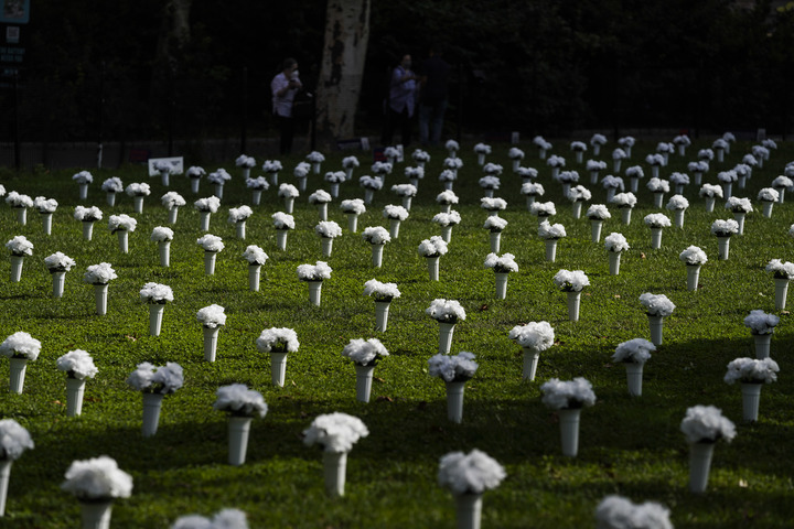 這是2021年10月8日在美國(guó)紐約炮臺(tái)公園內(nèi)拍攝的為悼念槍支暴力遇難者擺放的白色瓶花。新華社記者王迎攝