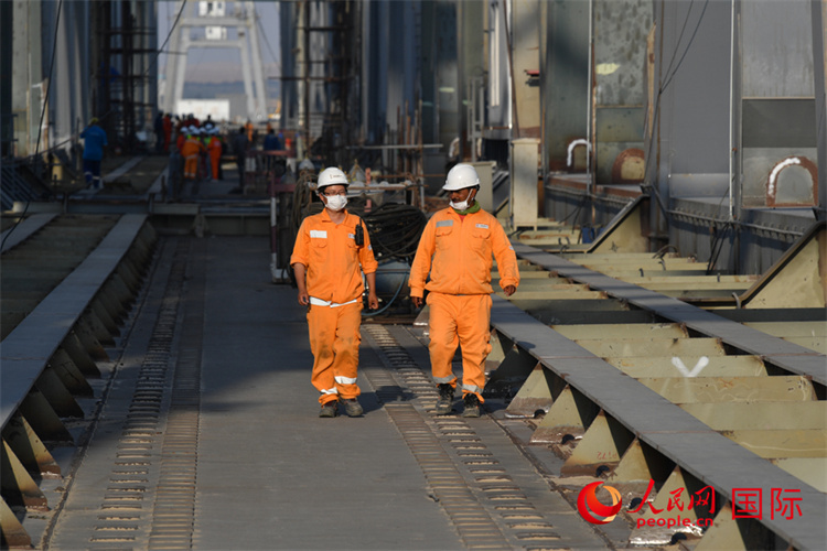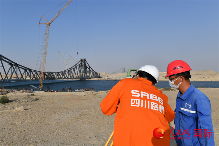 6月5日,埃及蘇伊士運河鐵路橋上的中埃建設(shè)者。人民網(wǎng)記者 李涼攝 |