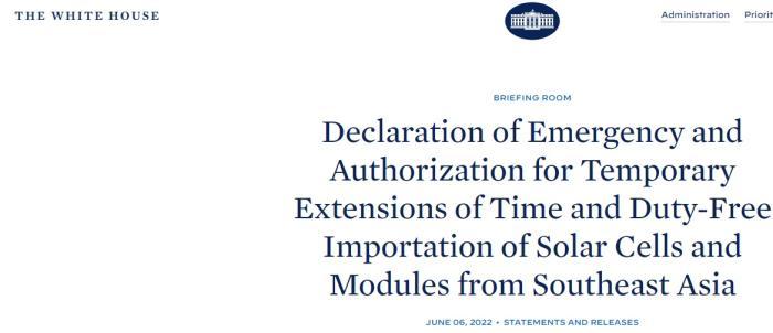 美國(guó)白宮有關(guān)宣布能源緊急狀態(tài)和豁免東南亞太陽(yáng)能組件進(jìn)口的聲明。圖片來(lái)源:白宮網(wǎng)站