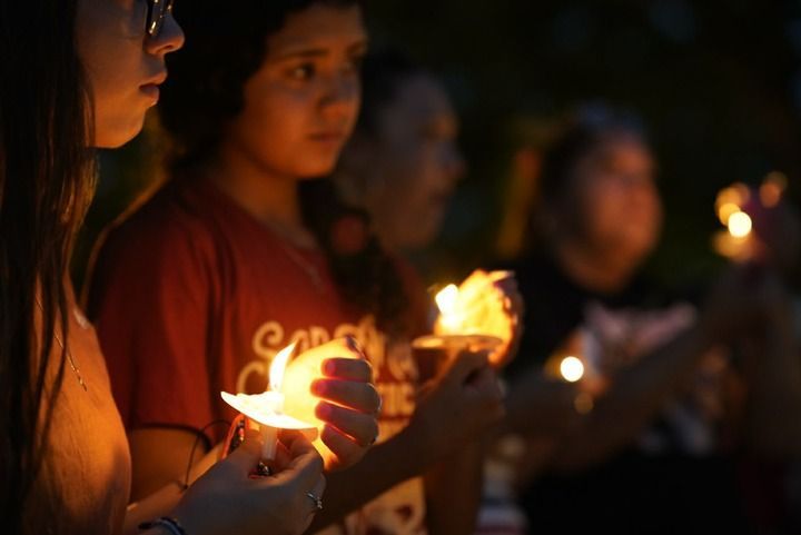 5月29日,在美國得克薩斯州南部尤瓦爾迪市的城市廣場,市民為槍擊事件遇害者守夜。新華社記者吳曉凌攝