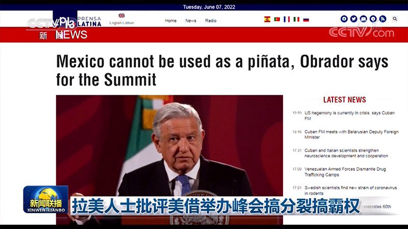 央視網(wǎng)消息(新聞聯(lián)播):第九屆美洲峰會將于當(dāng)?shù)貢r間8日在美國洛杉磯正式開幕,美國拒絕邀請古巴、委內(nèi)瑞拉和尼加拉瓜參會,拉美多國人士批評美國借舉辦峰會搞霸權(quán)。