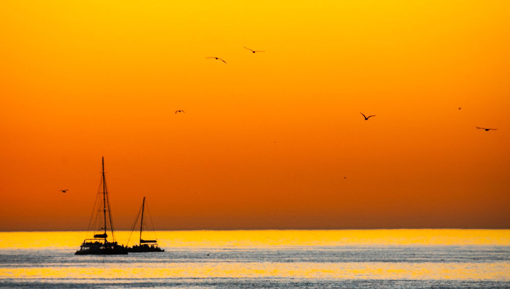 ↑船只于日落時(shí)分在南非開普敦海濱航行。