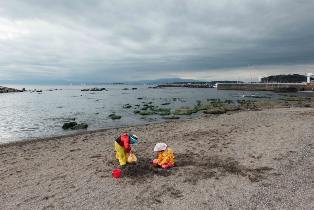 ↑兩個(gè)小孩在日本神奈川縣三浦郡葉山町海邊玩沙。