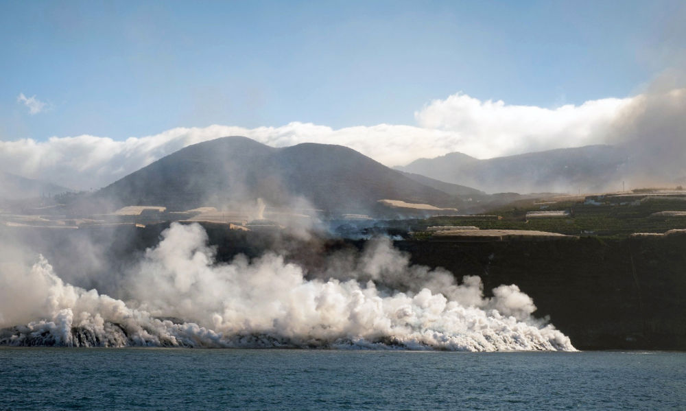 ↑西班牙拉帕爾馬島火山噴發(fā)的巖漿進(jìn)入大海。新華社發(fā)(西班牙海洋研究所供圖)