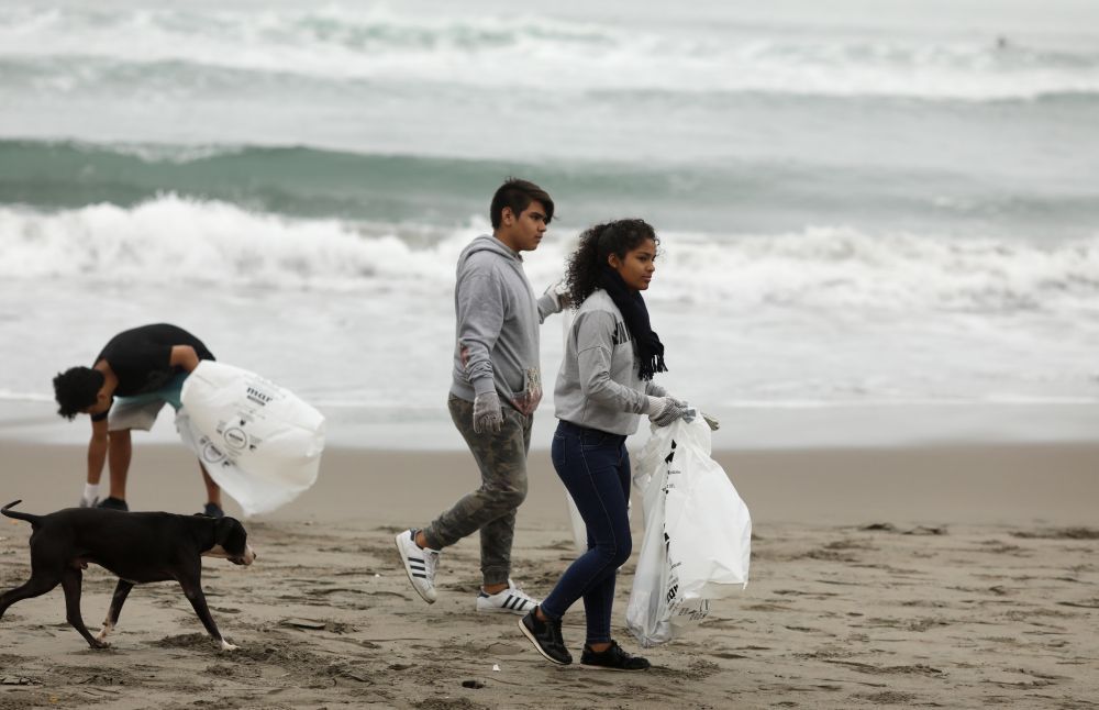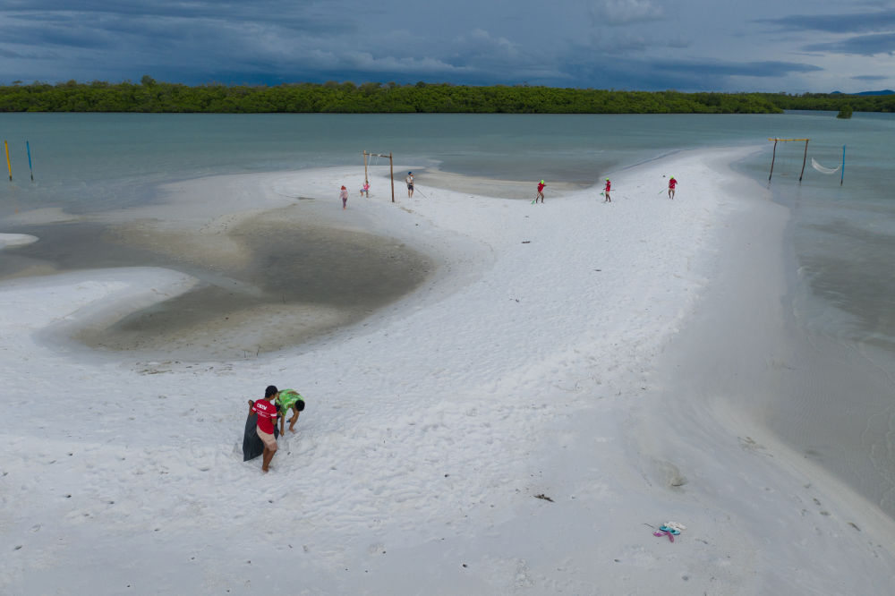 ↑人們?cè)谟《饶嵛鱽啺罴游鹄锒词±钔鯈u的白色海床清理垃圾(無(wú)人機(jī)照片)。