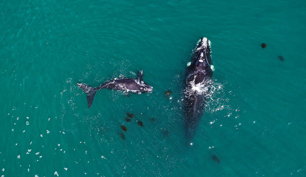 ↑在南非赫曼紐斯小鎮(zhèn)附近海面上,南露脊鯨在海岸邊暢游(無(wú)人機(jī)照片)。