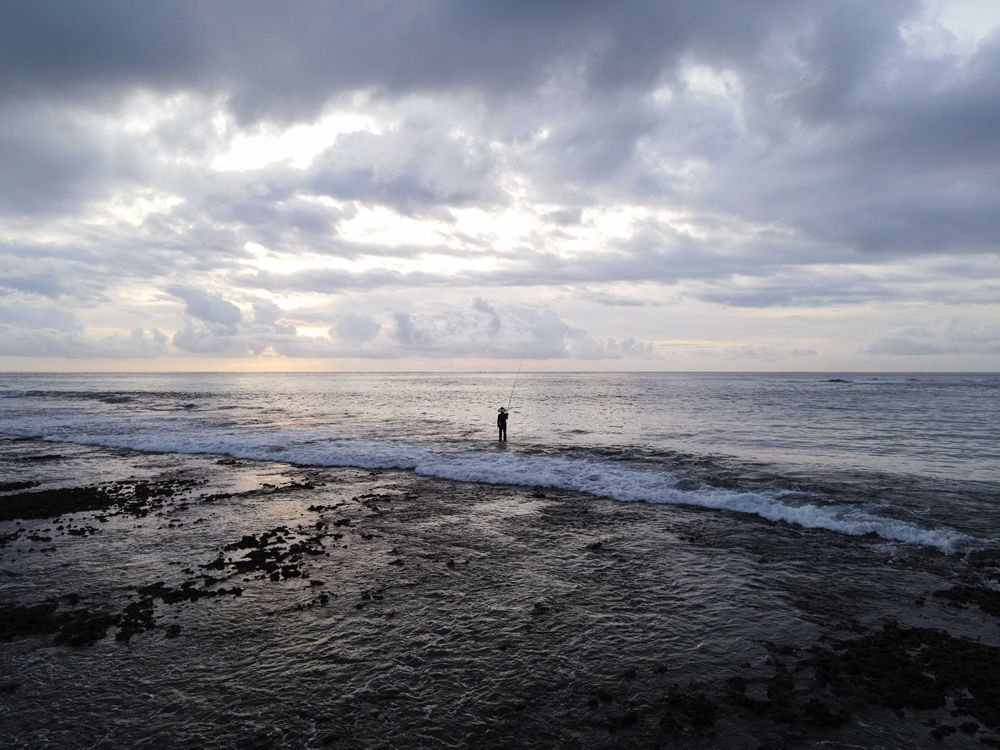 ↑一名男子站在印度尼西亞巴厘島的海邊垂釣。