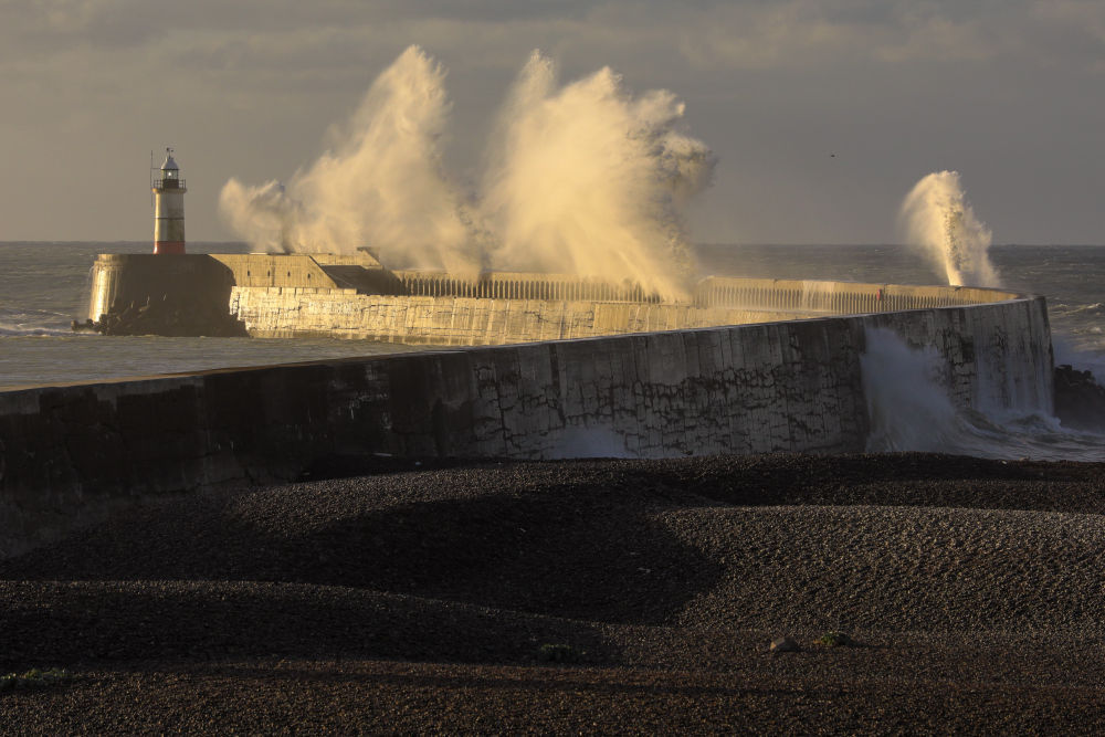 ↑英國(guó)紐黑文,海浪拍打港口的堤岸。