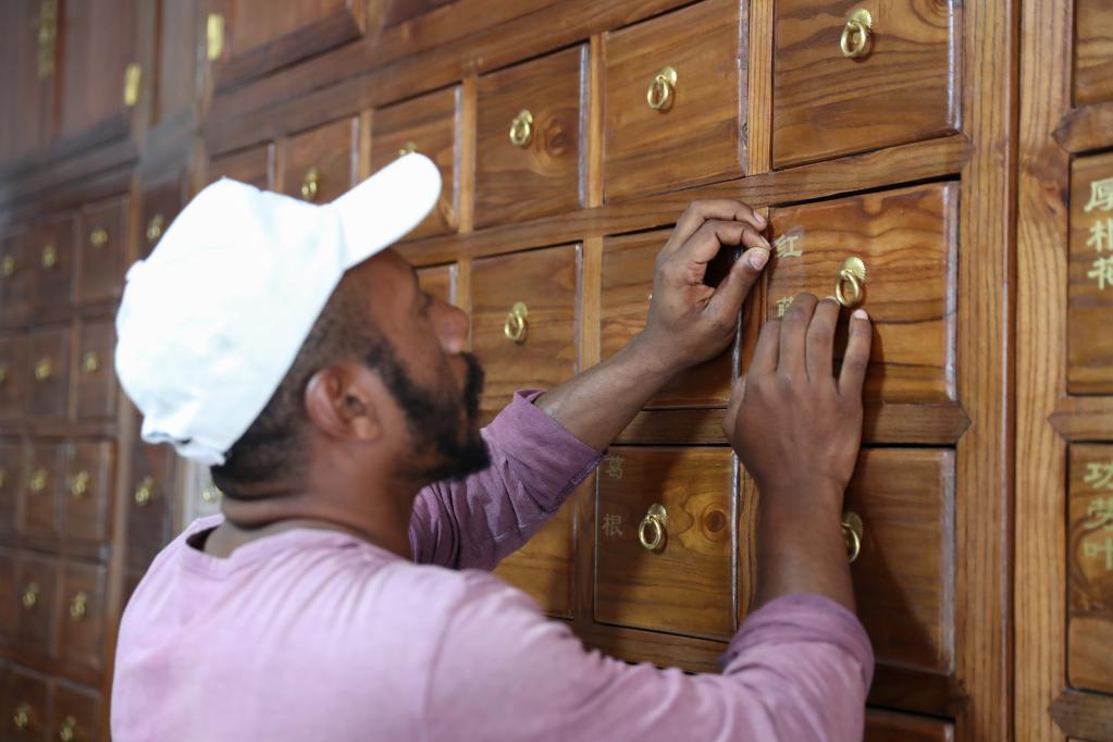 2018年11月10日,在巴布亞新幾內(nèi)亞莫爾茲比港中國(廣東)-巴新瘧疾防治中心,一位工作人員為防治中心的中藥房藥箱安裝中文說明。新華社記者白雪飛攝