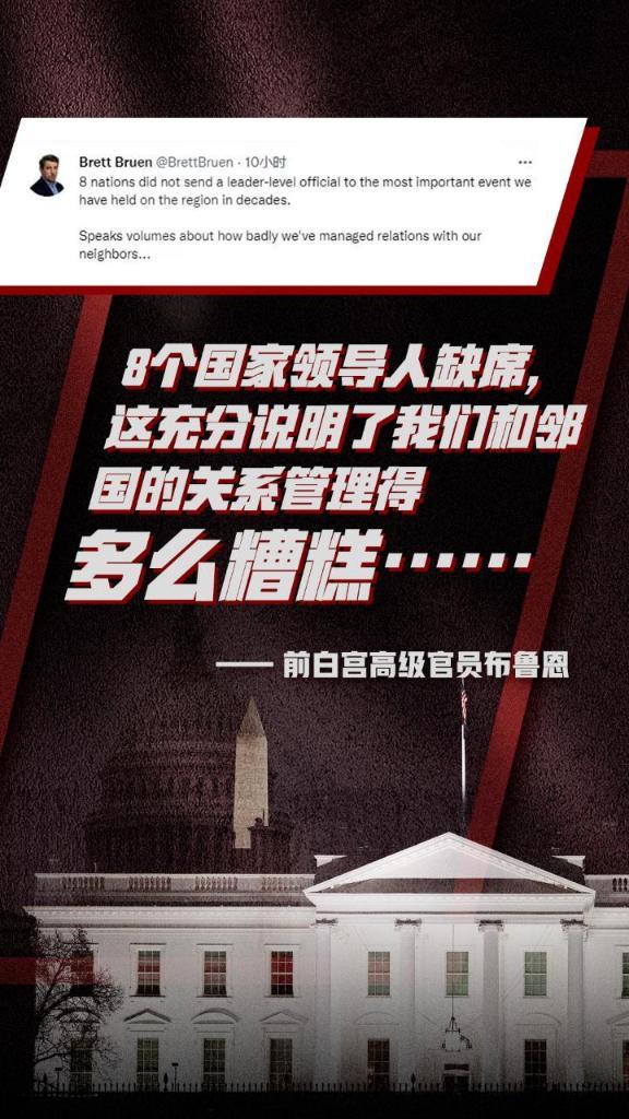 前白宮高級官員布雷特·布魯恩8日在推特上寫道:“8個國家沒有派出領(lǐng)導(dǎo)人級別的官員參加我們幾十年來主辦的本地區(qū)最重要的活動。這充分說明我們與鄰國的關(guān)系管理得多么糟糕……”