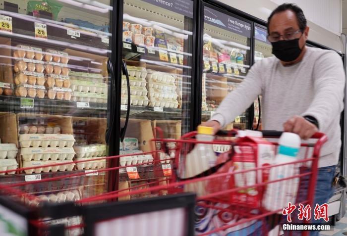 當?shù)貢r間4月5日,一名顧客從美國加州圣馬特奧縣一家超市的雞蛋貨柜前經(jīng)過。 中新社記者 劉關(guān)關(guān) 攝