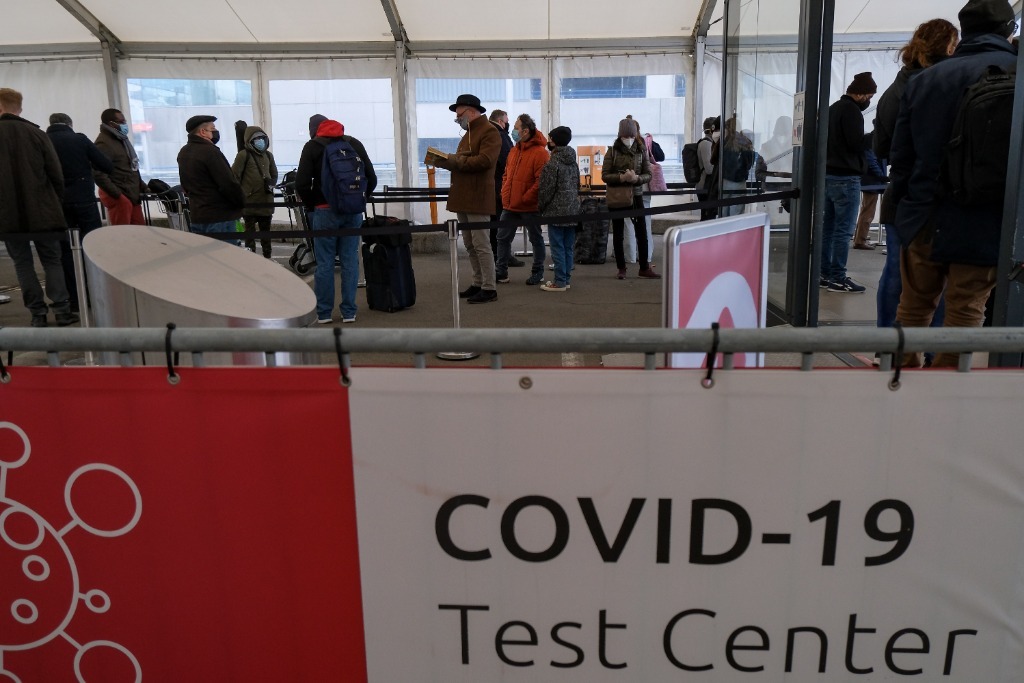 1月8日,在比利時布魯塞爾國際機場的新冠檢測中心,人們等待做檢測。新華社記者張鋮攝