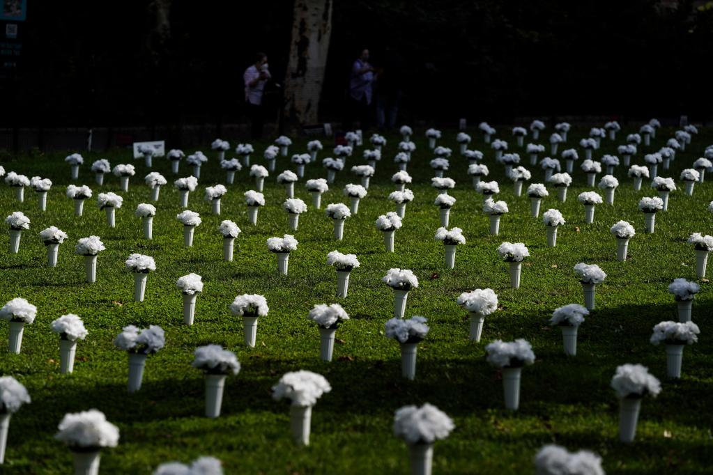 這是2021年10月8日在美國紐約炮臺公園內(nèi)拍攝的為悼念槍支暴力遇難者擺放的白色瓶花。(新華社記者王迎攝)