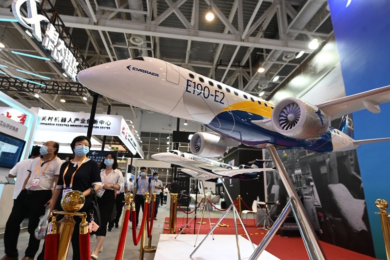 ↑2021年9月8日,2021金磚國家新工業(yè)革命展巴西航空工業(yè)公司展位上展出飛機模型。新華社記者 林善傳 攝