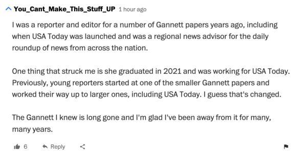 讓我十分震驚的是,她(加布麗埃拉·米蘭達(dá))2021年畢業(yè)就能在《今日美國報(bào)》工作。過去年輕記者都是從甘尼特旗下的一些小報(bào)干起,然后通過努力一步步升入包括《今日美國報(bào)》在內(nèi)的大報(bào)。我想現(xiàn)在可能不是這樣了。