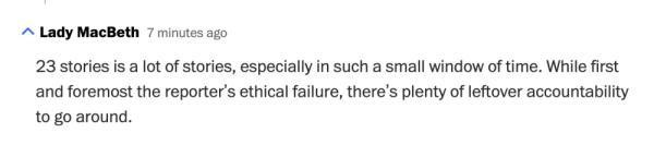 網(wǎng)友Lady MacBeth:23篇報(bào)道著實(shí)很多,尤其是在那么短的時(shí)間內(nèi)。首先,也是最重要的一點(diǎn),是這名記者的道德失敗,但除此之外還有很多環(huán)節(jié)需要被問責(zé)。