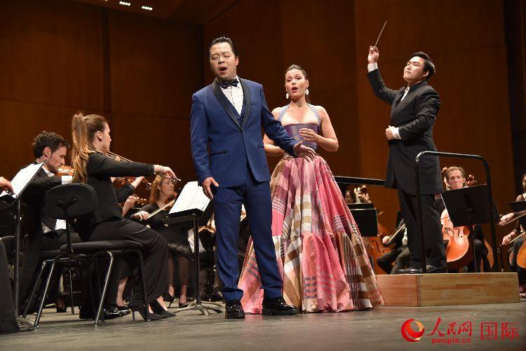 中國男高音魯智全和法國女高音厄米尼·勃朗德爾共同獻唱。人民網(wǎng)記者 劉玲玲攝 |