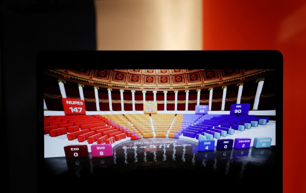 6月20日凌晨在法國巴黎拍攝的視頻畫面顯示,法國國民議會選舉第二輪投票的初步統(tǒng)計結(jié)果。新華社記者高靜攝