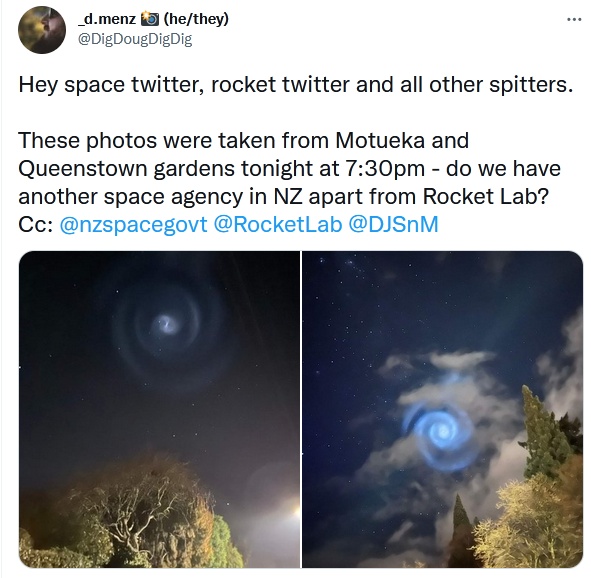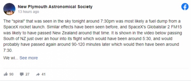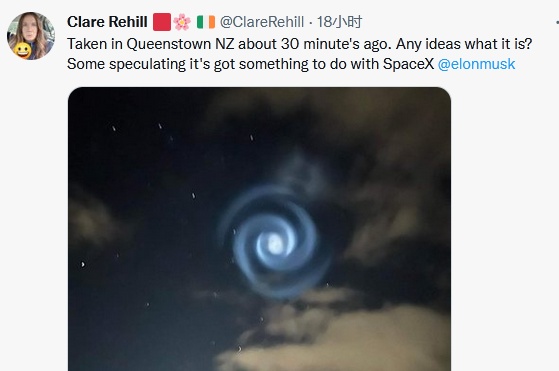 報(bào)道稱,這種現(xiàn)象似乎是“人為”的。新西蘭新普利茅斯天文學(xué)會(huì)19日晚在臉書上寫道,當(dāng)晚7點(diǎn)半左右在天空中看到的“螺旋”很可能是SpaceX火箭發(fā)射的尾跡?!?/p>