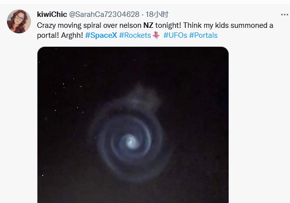 另一名推特網(wǎng)民也分享了照片并寫道:“今晚在新西蘭納爾遜市上空瘋狂旋轉(zhuǎn)!還以為我的孩子們召喚了一個(gè)入口!”↓