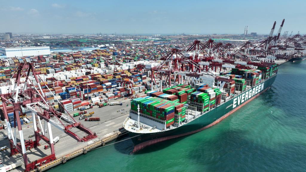 繁忙航線:平均每兩分鐘就有金磚國家貨物裝卸的青島港。(6月15日攝,無人機照片)。新華社記者李紫恒攝
