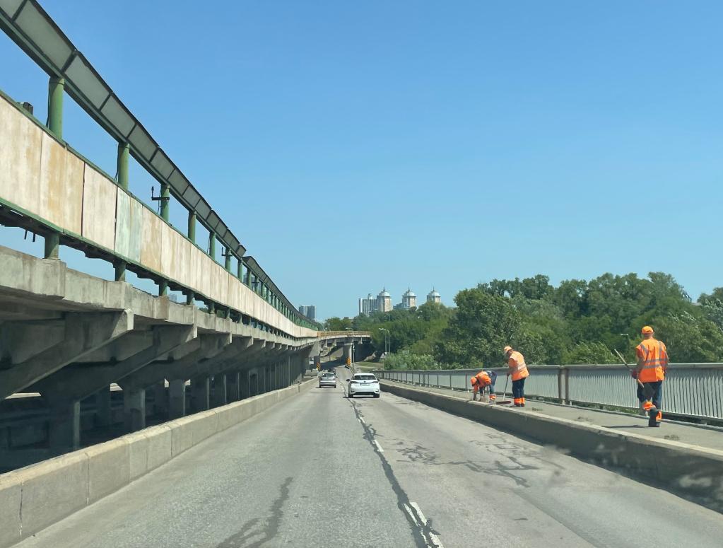 6月20日,市政人員在烏克蘭基輔修復(fù)受損的地鐵橋路面。新華社記者李東旭攝