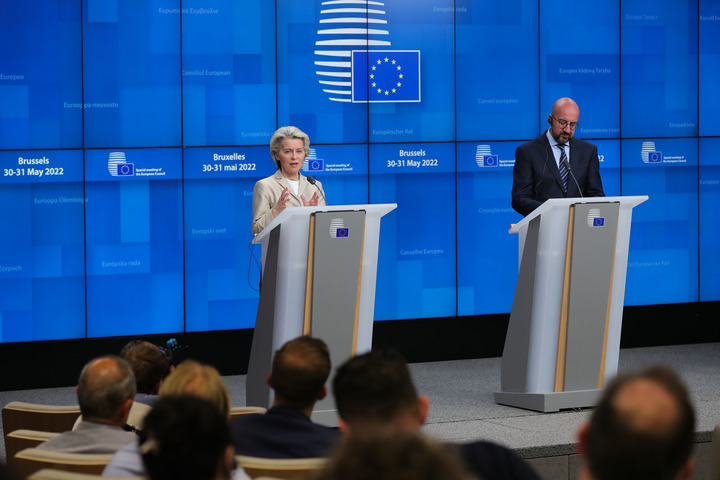 5月31日,在比利時布魯塞爾,歐盟委員會主席馮德萊恩(左)和歐洲理事會主席米歇爾在歐盟特別峰會后舉行新聞發(fā)布會。新華社記者鄭煥松攝