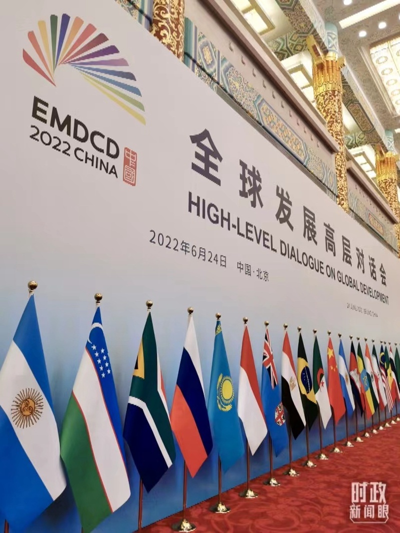 全球發(fā)展高層對(duì)話會(huì)的中方會(huì)場(chǎng),設(shè)在人民大會(huì)堂金色大廳。林立的參會(huì)國(guó)旗幟、紅色的地毯,映襯著會(huì)議的熱度。