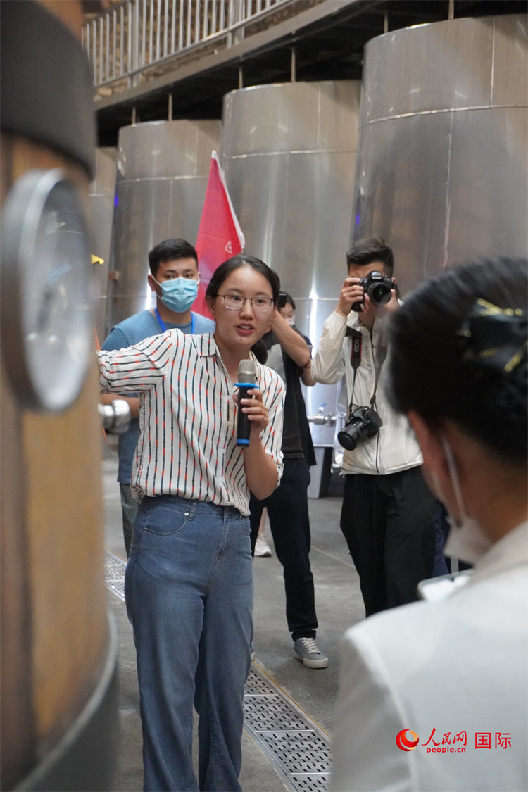志輝源石酒莊總經(jīng)理袁園介紹酒莊釀造工藝。人民網(wǎng)記者 何蒨攝 |