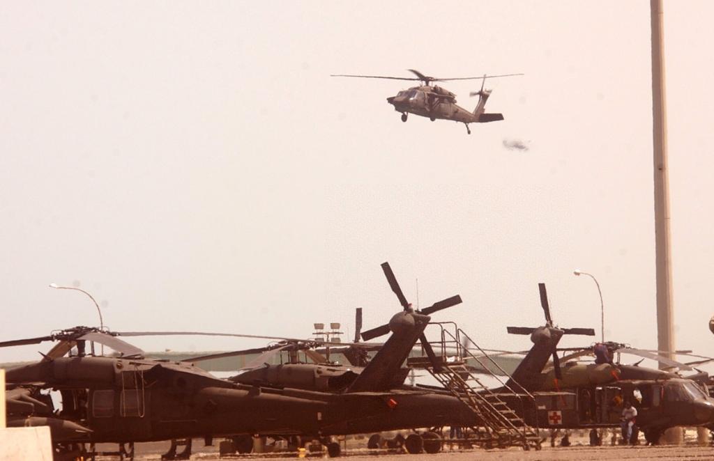 這是2003年4月14日,幾十架抵達科威特的美軍“黑鷹”及“阿帕奇”武裝直升機準備從科威特城港口起飛,增援伊拉克前線。新華社記者 李曉果 攝