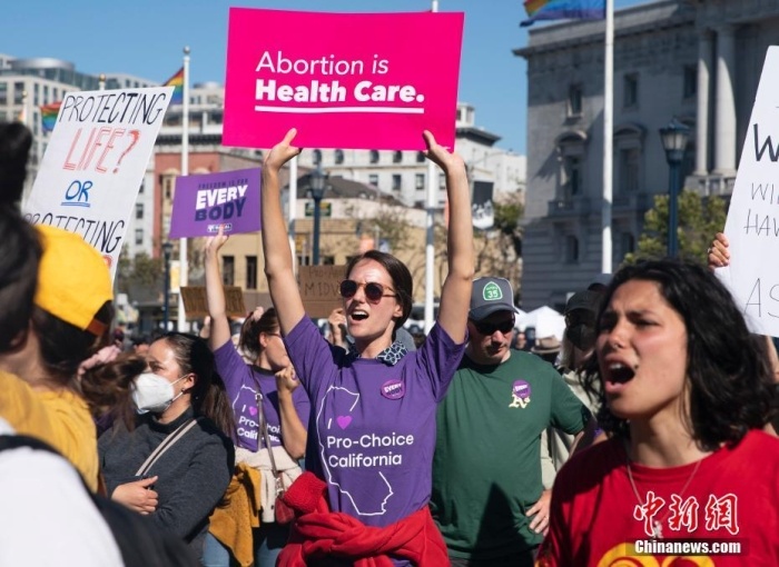 當(dāng)?shù)貢r間6月24日,美國舊金山民眾聚集在市政廳前,抗議美聯(lián)邦最高法院推翻羅訴韋德案。 中新社記者 劉關(guān)關(guān) 攝