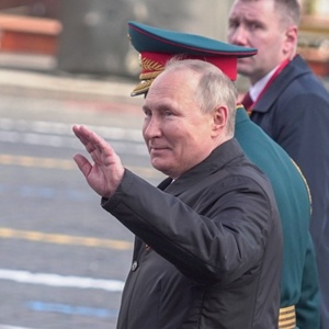 5月9日,在俄羅斯首都莫斯科,俄羅斯總統(tǒng)普京(前)在閱兵式后走過紅場。新華社記者苑欣芳攝