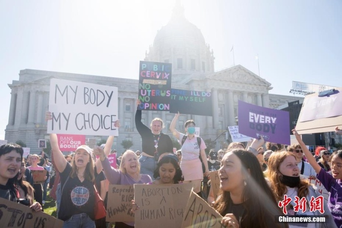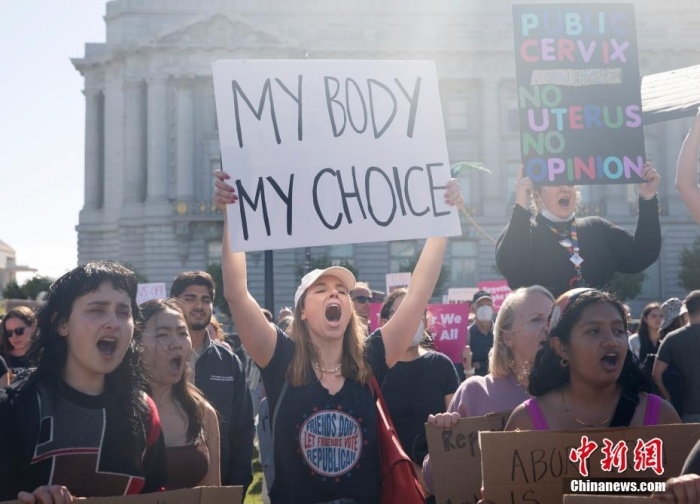 當?shù)貢r間6月24日,美國舊金山民眾聚集在市政廳前,抗議美聯(lián)邦最高法院推翻羅訴韋德案。 中新社記者 劉關關 攝