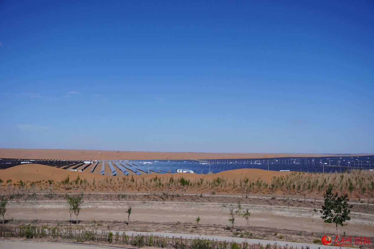 中衛(wèi)市沙漠光伏產(chǎn)業(yè)園中如碧湖般泛藍(lán)的太陽能光伏板。人民網(wǎng)記者 何蒨攝 |