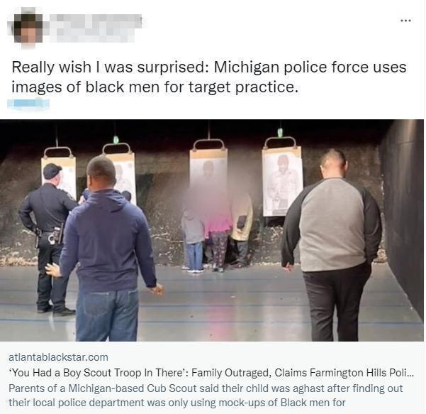 據(jù)報(bào)道,一隊(duì)童子軍4月參觀密歇根州法明頓希爾斯警察局的靶場時(shí)發(fā)現(xiàn),靶場內(nèi)懸掛著至少3張持槍非裔男子照片,供警察練習(xí)射擊技巧。這一事件曝光后在當(dāng)?shù)匾l(fā)爭議。
