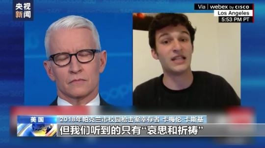 2018年帕克蘭市校園槍擊案幸存者 卡梅倫·卡斯基:全美的控槍活動人士和相信槍支安全法的人們都等著聽到“行政命令”這個詞,但我們聽到的只有“哀思和祈禱”。
