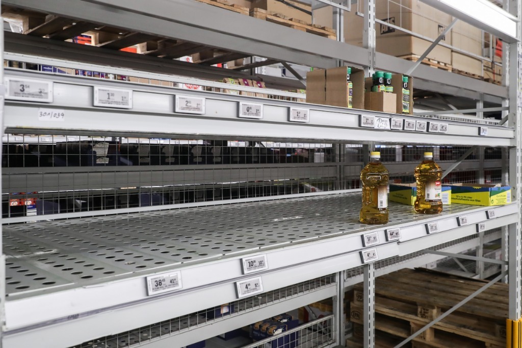 這是3月26日在德國(guó)首都柏林一家超市拍攝的商品短缺的食用油貨架。新華社記者單宇琦攝