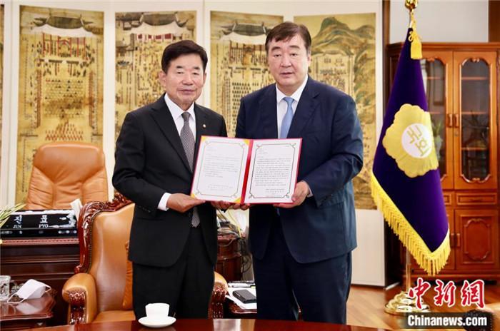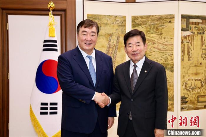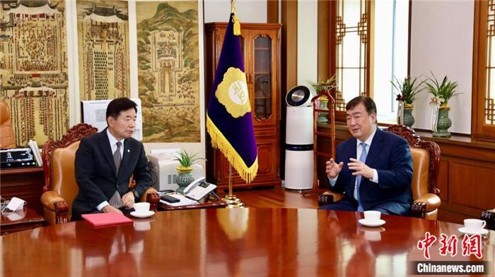 中國駐韓國大使邢海明(右)會見韓國國會議長金振杓。中國駐韓國大使館供圖