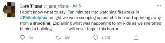 我不知道該說什么。今晚在費(fèi)城,我們才看了10分鐘的煙花就立馬抱起寶寶沖出去逃離槍擊。然后躲在一棟建筑物的遮蔽下向孩子們解釋剛才發(fā)生了什么……我永遠(yuǎn)也忘不了這種恐懼。