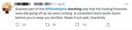 費(fèi)城槍擊案最可怕的地方在于,當(dāng)我們逃命的時候那些該死的煙花還在燃放。你的背后不斷響起一聲聲“砰,砰,砰”,讓你一直毛骨悚然。謝天謝地,我安全逃出來了。