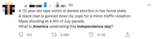 一個遭強(qiáng)奸的十歲小女孩在自己的家鄉(xiāng)州被拒絕墮胎的請求。一個黑人只因?yàn)橐淮涡⌒〉慕煌ㄟ`例而被警察射殺。一個獨(dú)立日的巡游隊(duì)伍中發(fā)生大規(guī)模槍擊事件。美國在獨(dú)立日這一天究竟要慶祝什么?