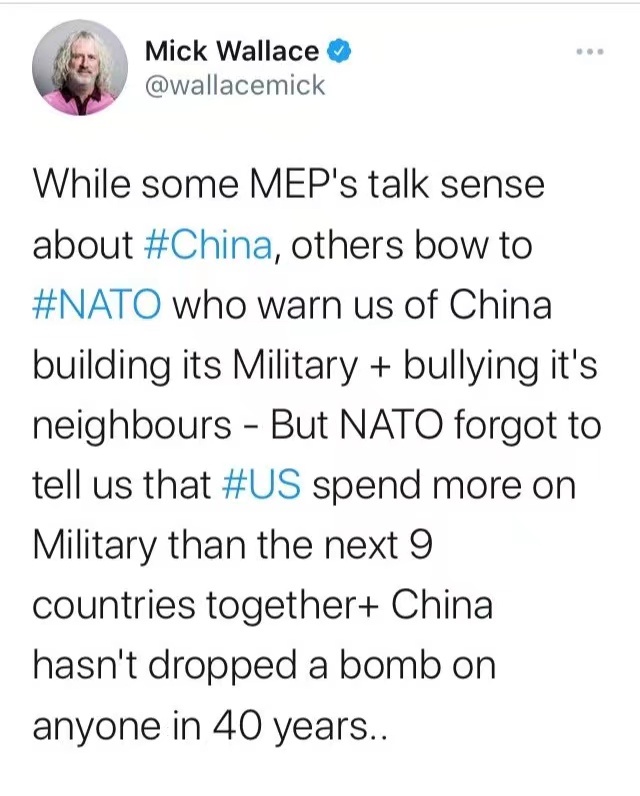 新華社北京7月7日電 歐洲議會議員米克·華萊士日前在社交媒體上發(fā)文,并發(fā)布了一段自己近期的發(fā)言視頻,批評北約唯美國馬首是瞻炒作“中國威脅論”的做法。