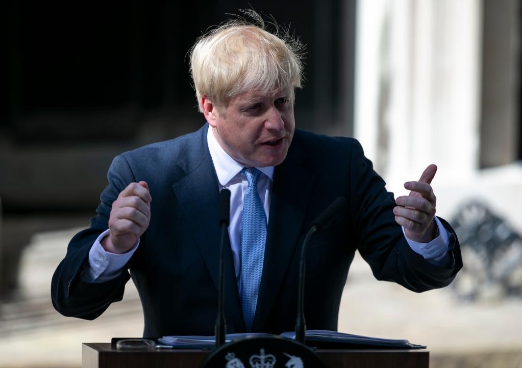 2019年7月24日,英國(guó)首相約翰遜上任后在唐寧街10號(hào)首相府門(mén)前發(fā)表講話(huà)。(新華社記者 韓巖 攝)