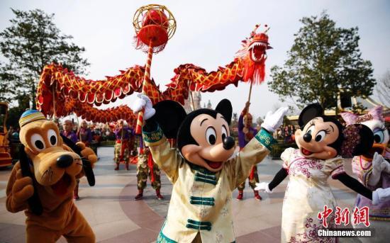 上海迪士尼樂園內(nèi)歡騰的舞龍表演奪人眼球,米奇和伙伴們用舞龍的方式喜迎中國農(nóng)歷新年的到來。中新社記者 湯彥俊 攝