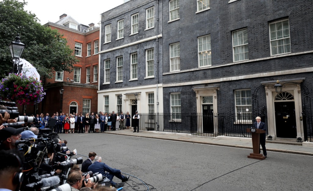 7月7日,英國首相鮑里斯·約翰遜在倫敦唐寧街10號門前發(fā)表講話。新華社記者李穎攝