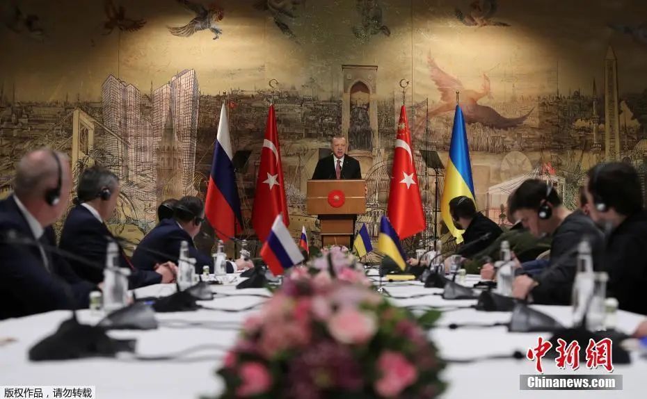 當(dāng)?shù)貢r(shí)間3月29日,俄羅斯和烏克蘭代表團(tuán)在土耳其伊斯坦布爾展開新一輪面對(duì)面談判。圖為土耳其總統(tǒng)埃爾多安在談判前講話。