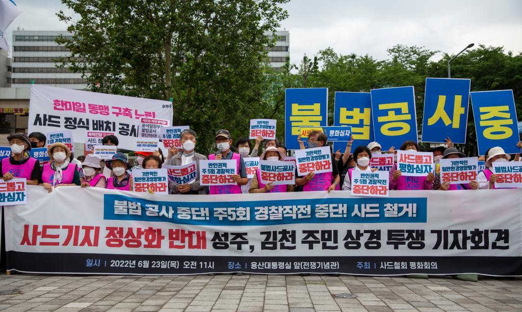 6月23日,韓國(guó)反“薩德”團(tuán)體在首爾集會(huì),反對(duì)政府推進(jìn)“薩德”基地運(yùn)營(yíng)正?;P氯A社記者王益亮攝